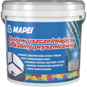 Zestaw zawiera: folię w płynie Mapegum WPS 4 kg, 6 mb taśmy uszczelniającej Mapeband, narożnik wewnętrzny i 2 mankiety ścienne.